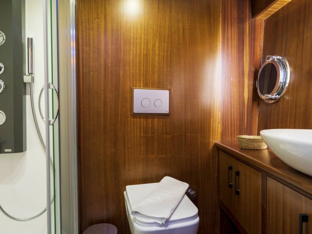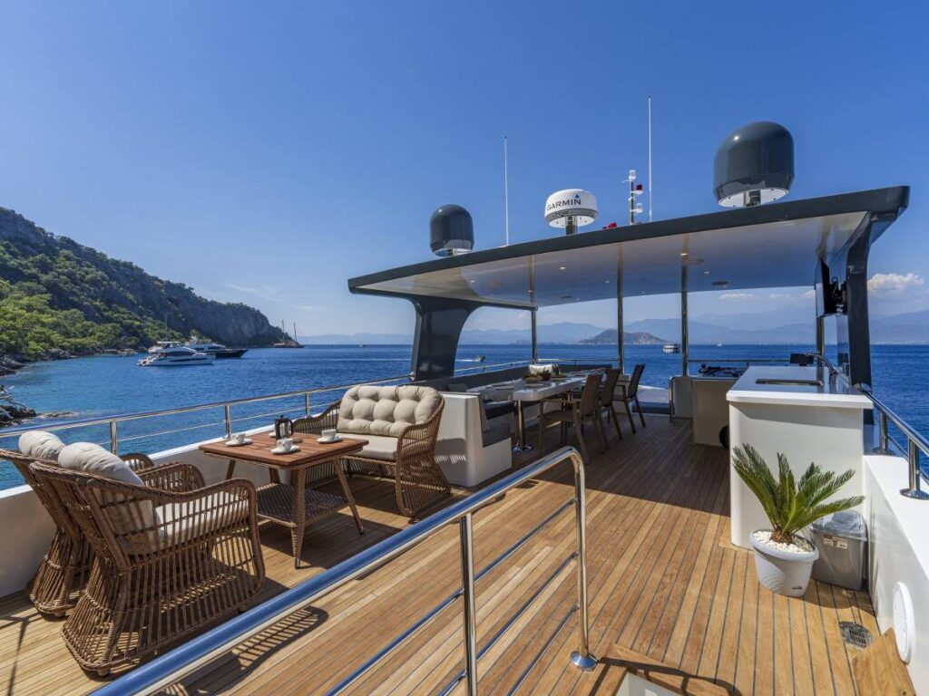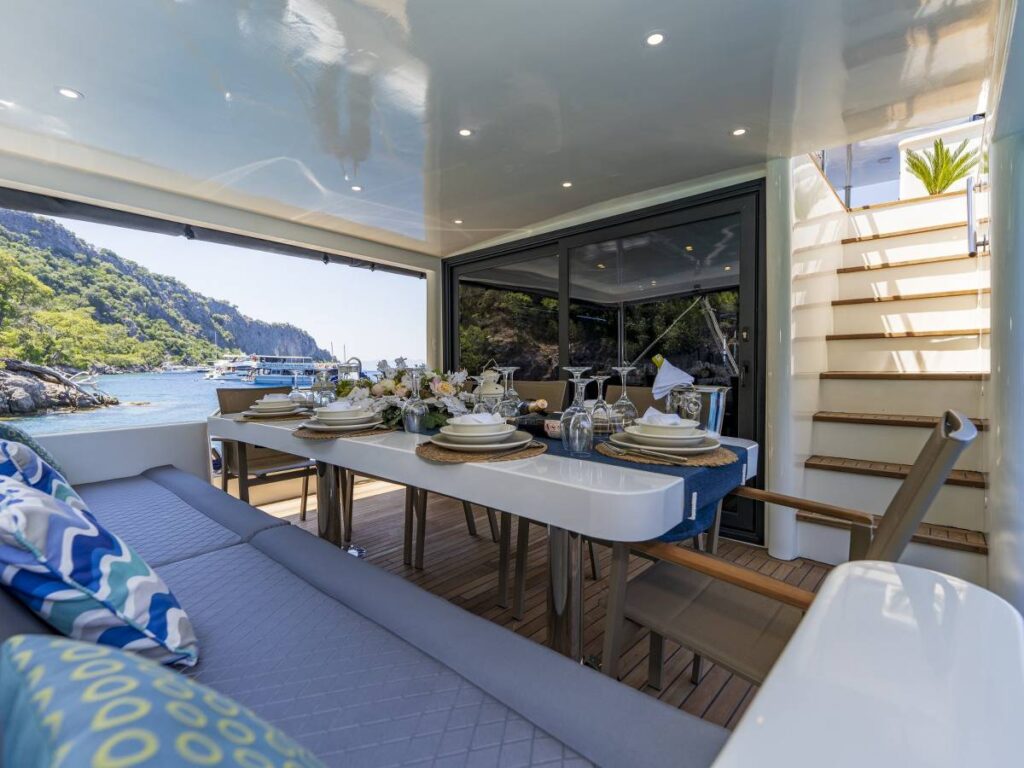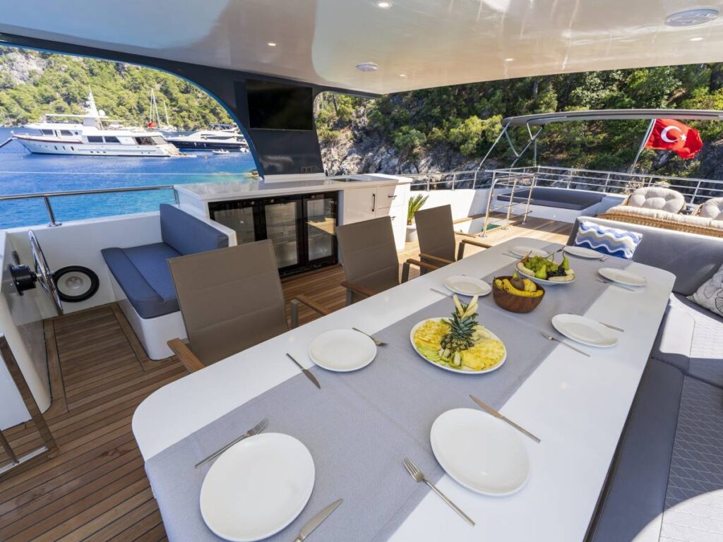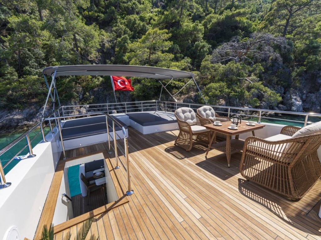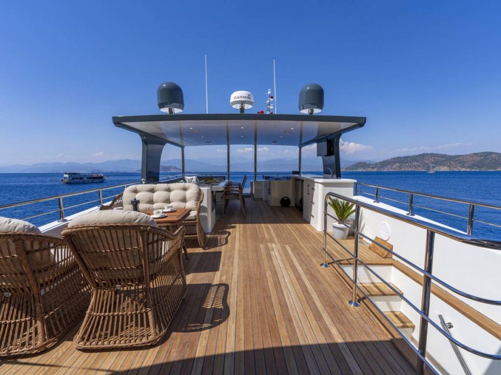 4 kabini- 8 kişilik kapasitesi ile Göcek’in eşsiz sularında seyir yapmaktadır. Tüm kabinler TV-Klima-WC-Müzik sistemi ile donatılmıştır. 24 saat sıcak su bulabilirsiniz. Kabinler konforlu ve ferahtır. Güverteler şık ve kullanım rahatlığı sağlar. Flybridge ise tam bir keyif alanıdır. Gününüzün çoğunu geçirebileceğiniz bu alan aynı zamanda size özel bir yaşam alanı da sağlar.