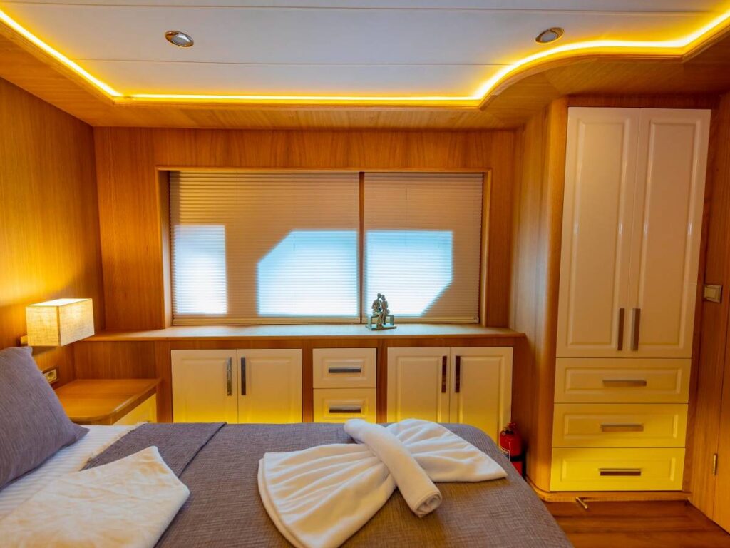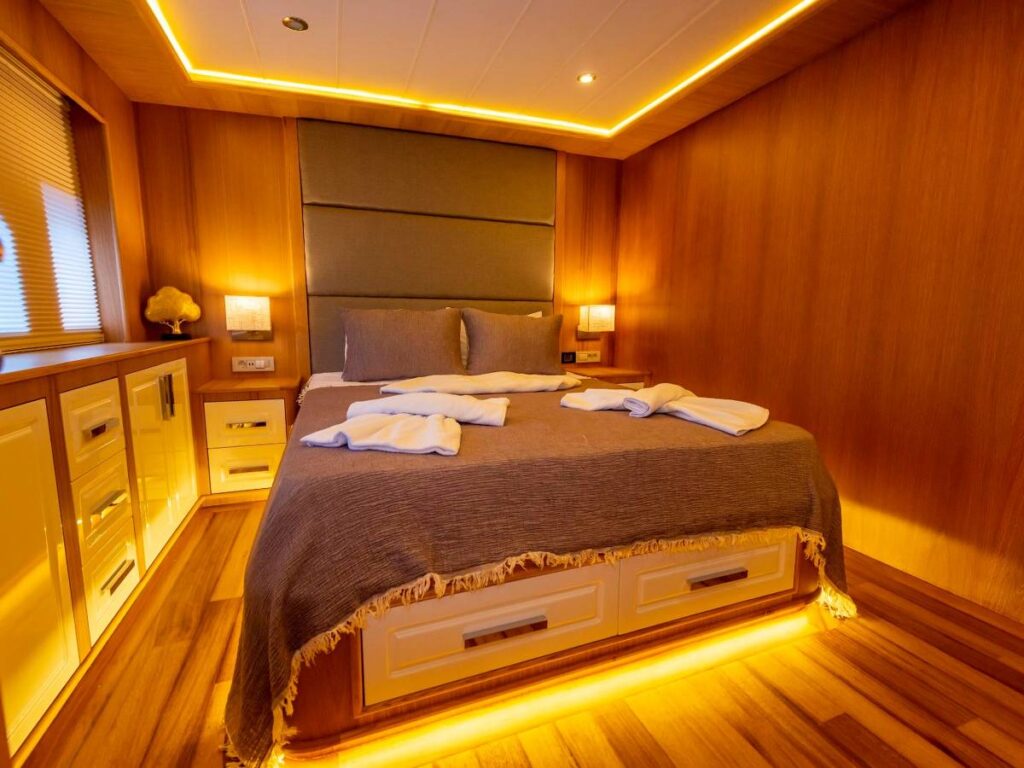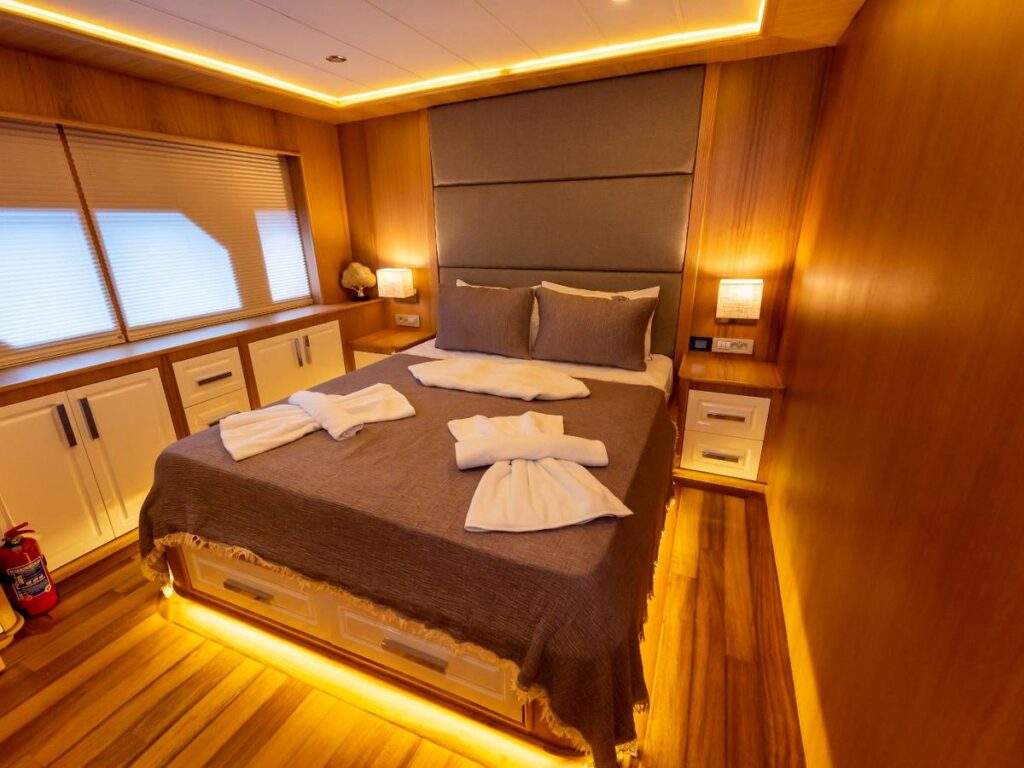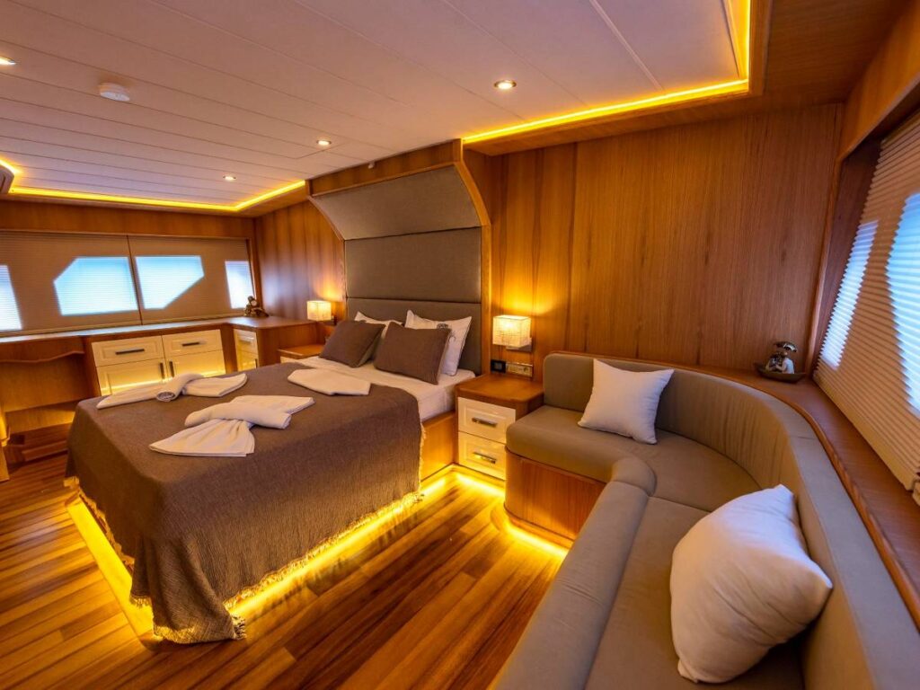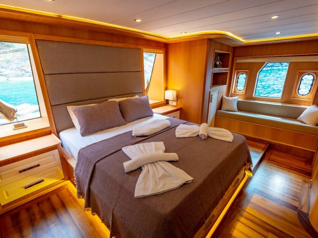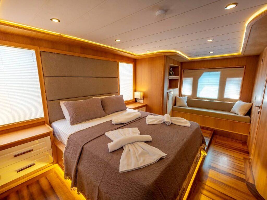 5 kabinli teknemiz 10 kişilik kapasitesi ile sizi tüm misafirperverliği ile ağırlayacak. Tüm kabinler ve salon klima ile donatılmıştır ve kabinler özel tasarım ürünüdür. İç ve dış mekanları oldukça konforlu ve zevkli döşenmiştir. Flybridge, size ayrı bir özel alan sunmakla kalmaz, tüm maviliklere özgür bir bakış açısı yakalar.