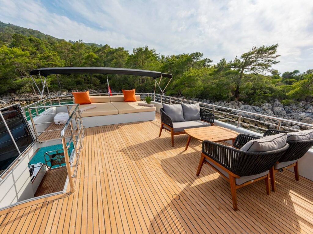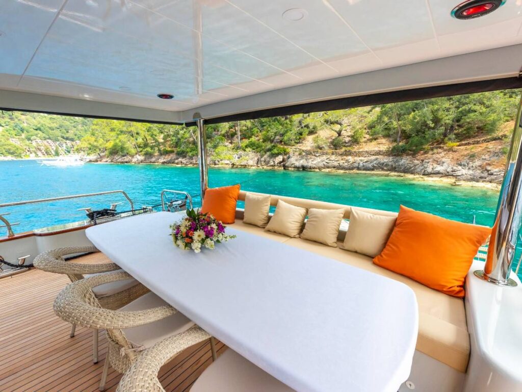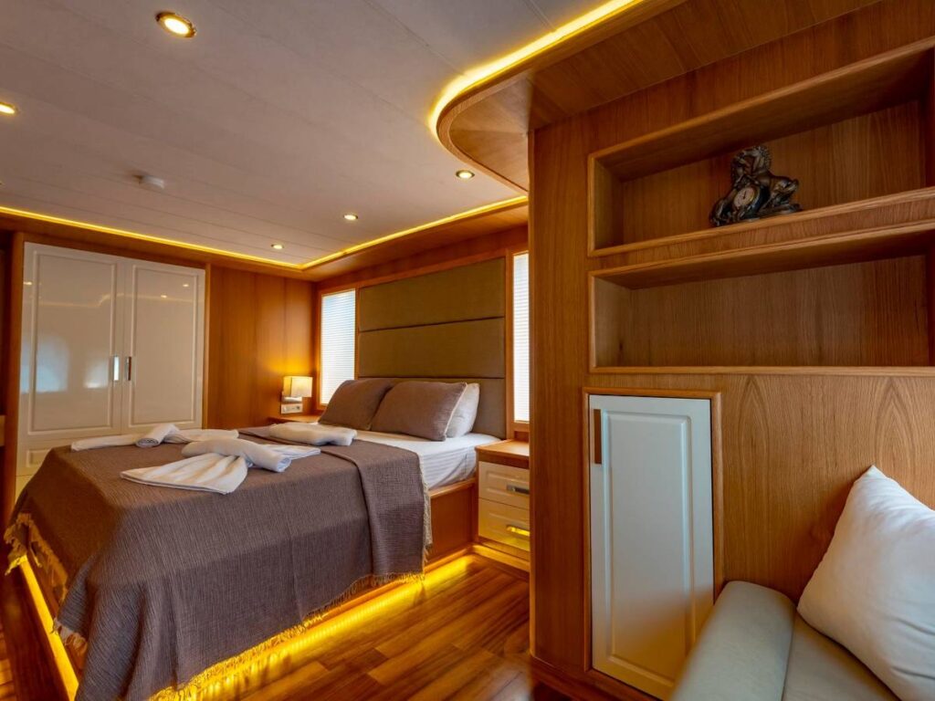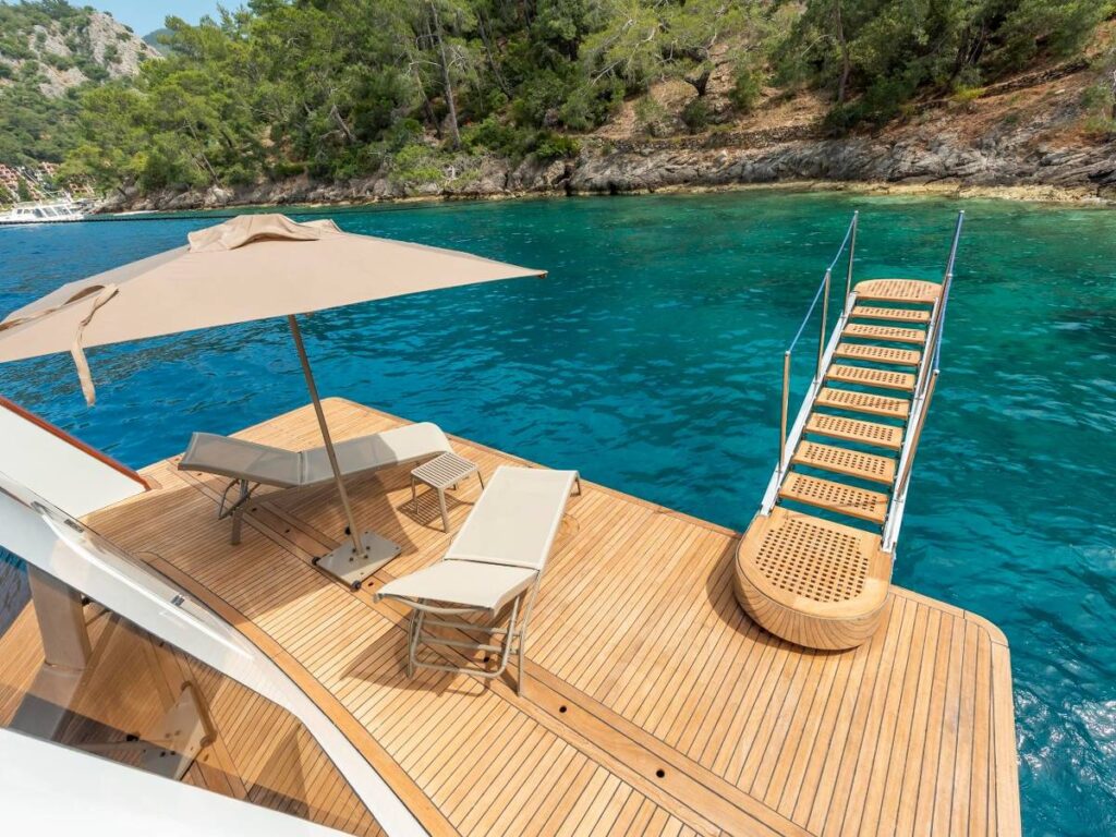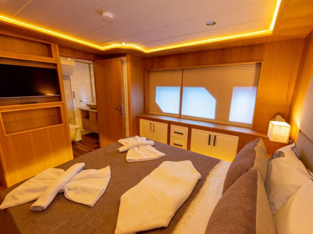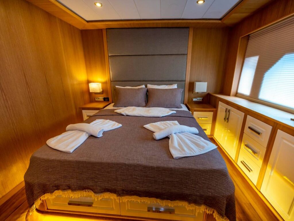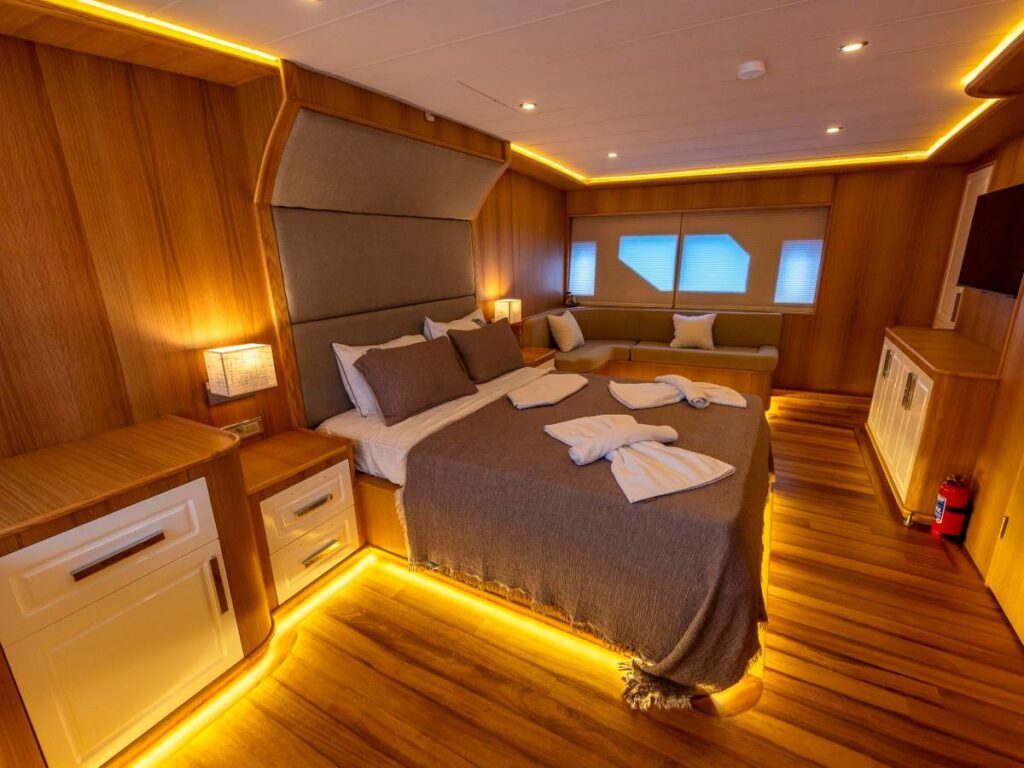 5 kabinli teknemiz 10 kişilik kapasitesi ile sizi tüm misafirperverliği ile ağırlayacak. Tüm kabinler ve salon klima ile donatılmıştır ve kabinler özel tasarım ürünüdür. İç ve dış mekanları oldukça konforlu ve zevkli döşenmiştir. Flybridge, size ayrı bir özel alan sunmakla kalmaz, tüm maviliklere özgür bir bakış açısı yakalar.